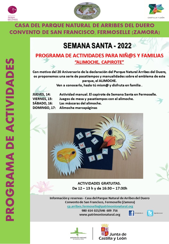 Durante el fin de semana de la Semana Santa, hemos dispuesto un espacio para que vengas a disfrutar de una actividad diferente cada día, sobre el ave que representa al Parque Natural Arribes del Duero: El Alimoche.