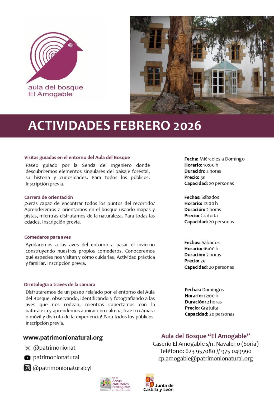 - Visita guiada: 3€ Carrera de orientación: 0€ Comederos de aves: 2€ Ornitología y cámara: 0€