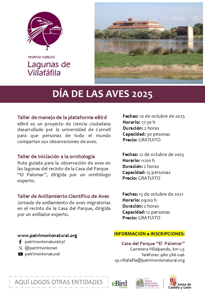 Con motivo de la celebración el próximo sábado día 11 de octubre del Día Mundial de las Aves Migratorias, desde la Casa del Parque El Palomar de Villafáfila, se organizan diferentes actividades en torno a las aves. Talleres de anillamiento, rutas guiadas para la observación de aves o talleres para el manejo de nuevas plataformas de ciencia ciudadana que mejoran el conocimiento de las aves que nos rodean.