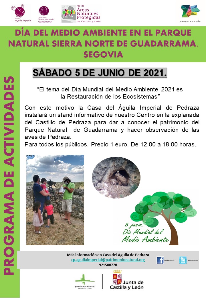 Con este motivo la Casa del Águila Imperial de Pedraza instalará un stand informativo de nuestro Centro en la explanada del Castillo de Pedraza para dar a conocer el patrimonio del Parque Natural de Guadarrama y hacer observación de las aves de Pedraza.