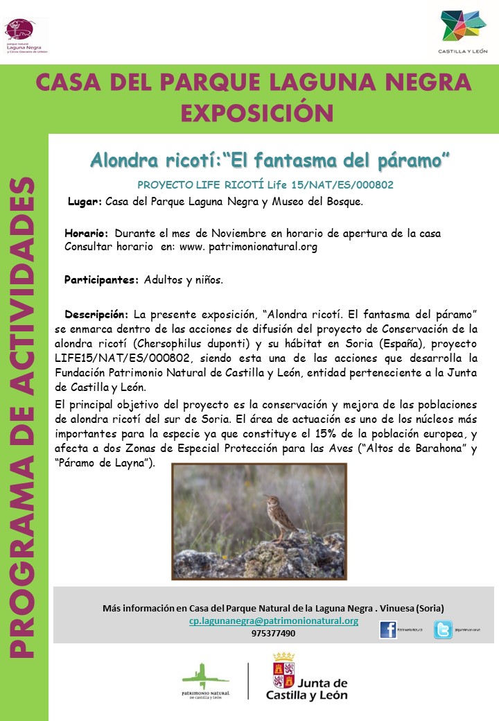 La presente exposición, “Alondra ricotí. El fantasma del páramo” se enmarca dentro de las acciones de difusión del proyecto de Conservación de la alondra ricotí (Chersophilus duponti) y su hábitat en Soria (España), proyecto LIFE15/NAT/ES/000802, siendo esta una de las acciones que desarrolla la Fundación Patrimonio Natural de Castilla y León, entidad perteneciente a la Junta de Castilla y León.