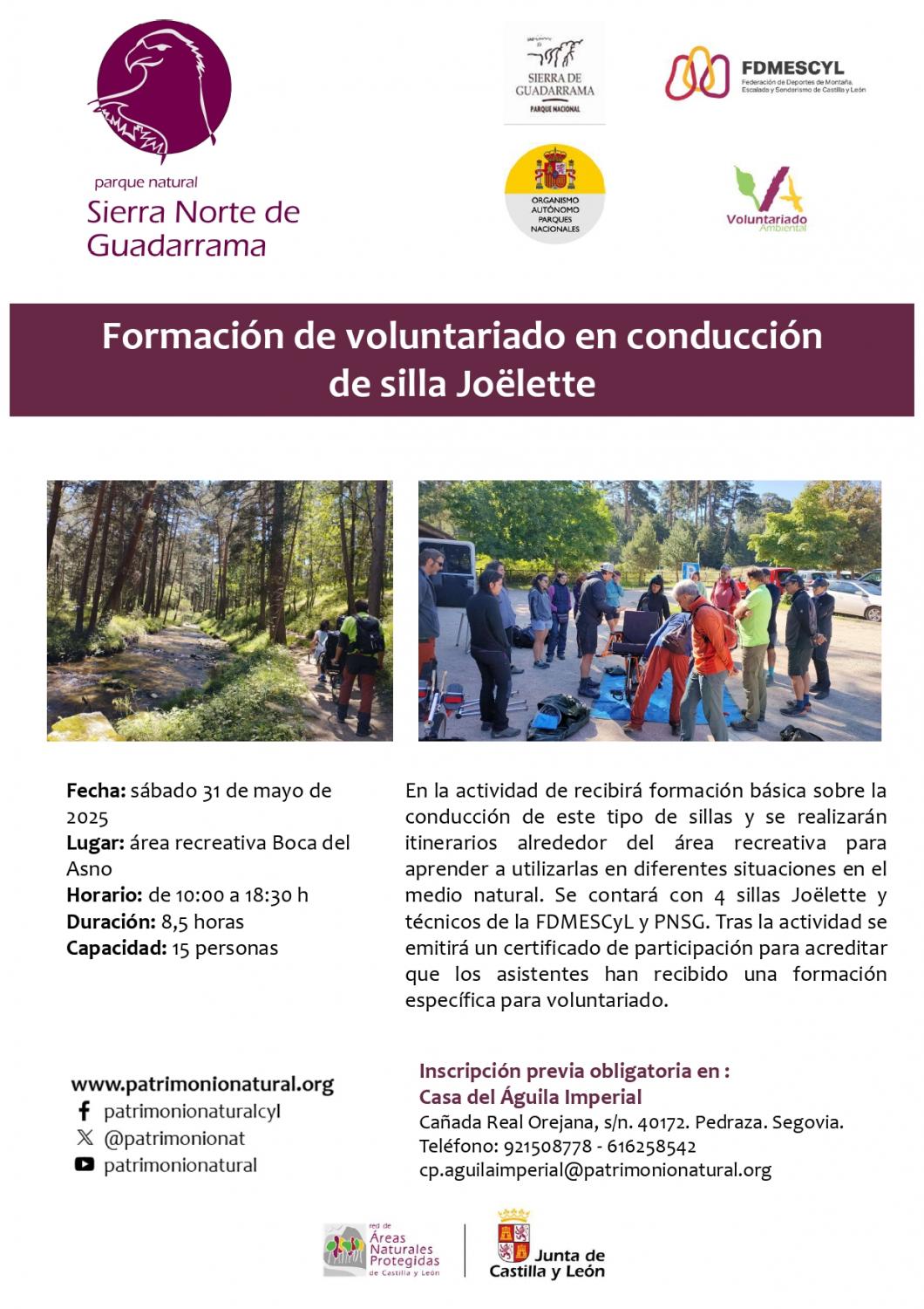 Se realizará un itinerario por los alrededores del área recreativa donde aprenderemos a utilizar las sillas Joëlette en diferentes situaciones en el medio natural. Se contará con 4 sillas Joëlette, dos perteneciente a la FDMESCyL y dos pertenecientes al PNSG. Tras la actividad se emitirá un certificado para acreditar que los asistentes han recibido una formación específica para voluntariado.