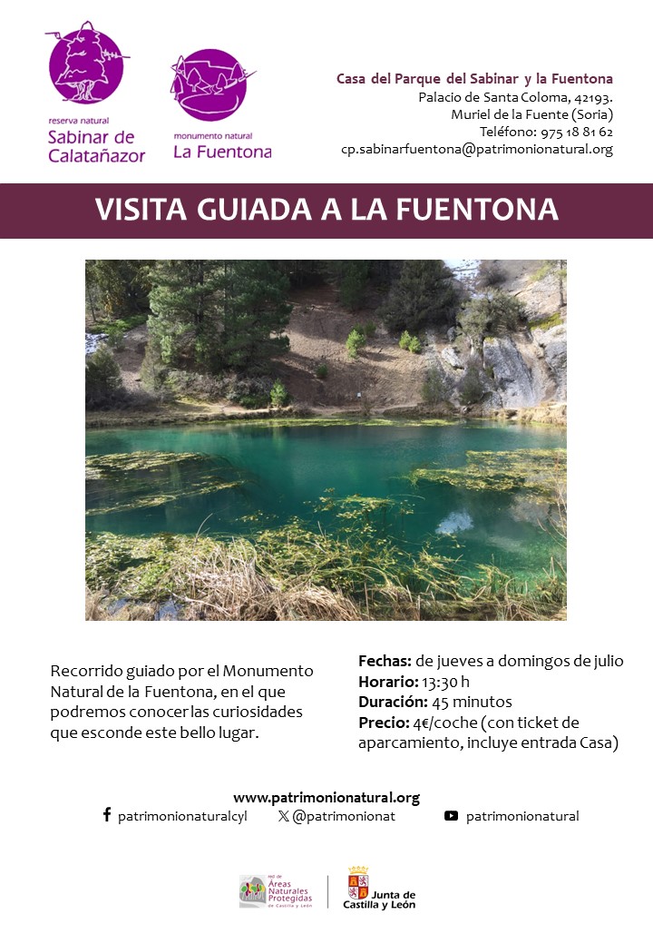Se realizará una ruta a lo largo del río Abión hasta la Fuentona. A lo largo de todo el recorrido se podrá disfrutar de la transparencia del agua del río Abión y su color azul turquesa, así como de las impresionantes sabinas que crecen en este lugar tan singular. El recorrido de 800 m (solo ida) tiene una dificultad baja y está pensado para ser realizado por familias. La actividad estará guiada por un educador ambiental de la Casa del Parque del Sabinar y la Fuentona, y el punto de partida es el aparcamiento 2 de La Fuentona (Soria)/Punto de Observación de Fauna. Horario: 13:30 h.