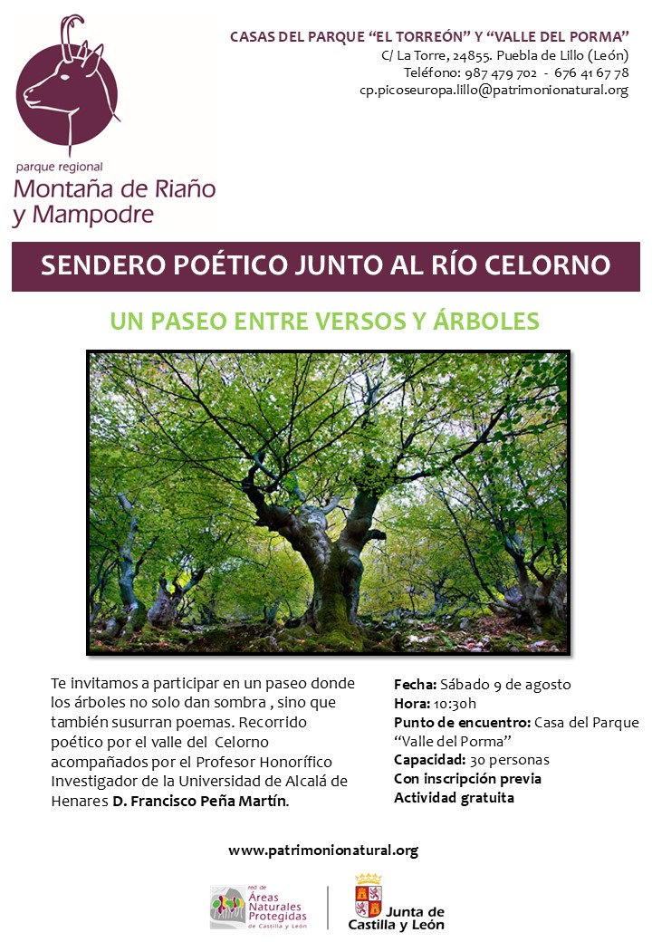 Te invitamos a participar en este paseo por el valle del Celorno, guiado por los educadores ambientales de las Casas del Parque de Puebla de Lillo, que hablarán de los valores naturales de los árboles del recorrido mientras se leerán diferentes poemas en cada parada. Cada parada poética se situará junto a un elemento destacado del entorno, como un árbol singular, una fuente o la vista de una montaña. Una propuesta ideal que une naturaleza y cultura.